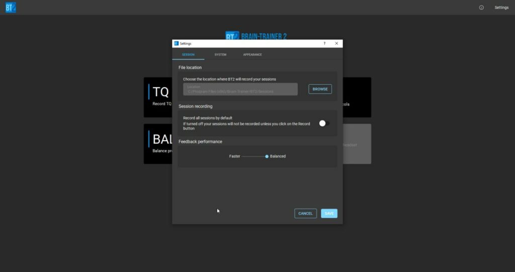 Session tab see “File location.” This is the default location where your program will save your recording files and where you will go to select and open a saved recording for review. The default location is C: \ \ Program Files (x86) \ Brain-Trainer \ BT2 \ Sessions.